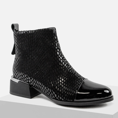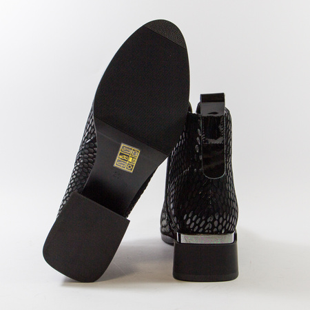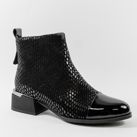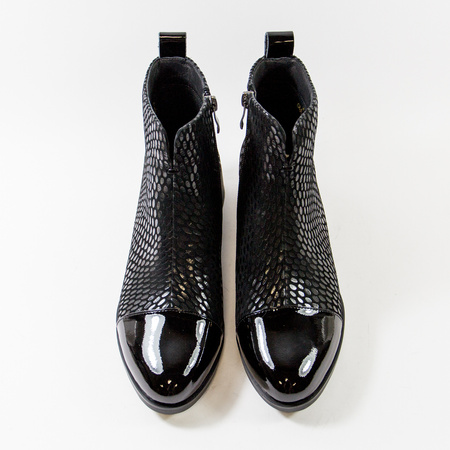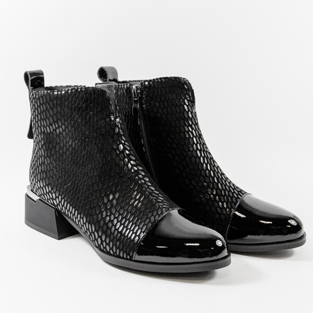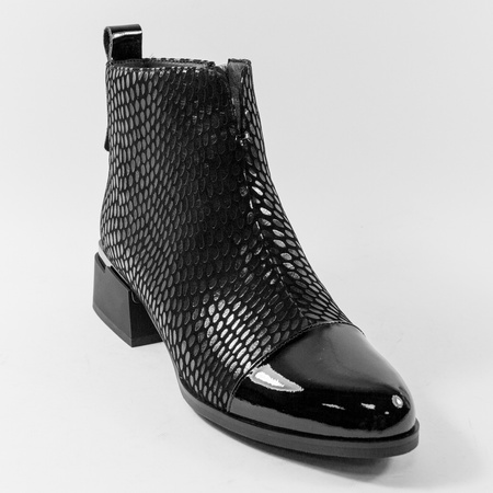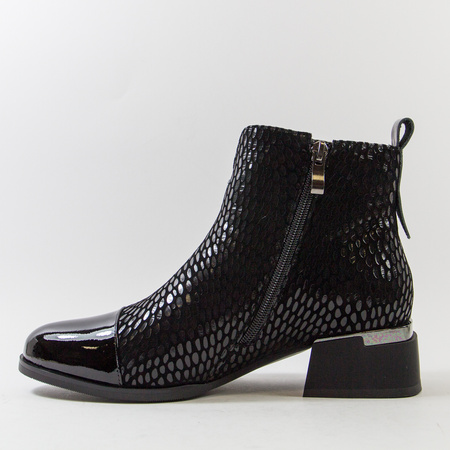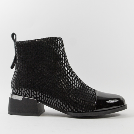 Śliczne botki damskie w kolorze czarnym. Eleganckie damskie botki o fasonie sztybletów wykonane z miękkiego zamszu z efektownym lakierowanym nadrukiem, który dodaje im wyjątkowego charakteru. Lakierowany nosek podkreśla stylowy wygląd, a szeroki, dekoracyjny obcas zapewnia stabilność i wygodę noszenia. Botki posiadają praktyczne zapięcie na suwak, które ułatwia zakładanie, oraz ocieplane wnętrze gwarantujące komfort w chłodniejsze dni. To modny model idealny zarówno do codziennych, jak i eleganckich stylizacji.